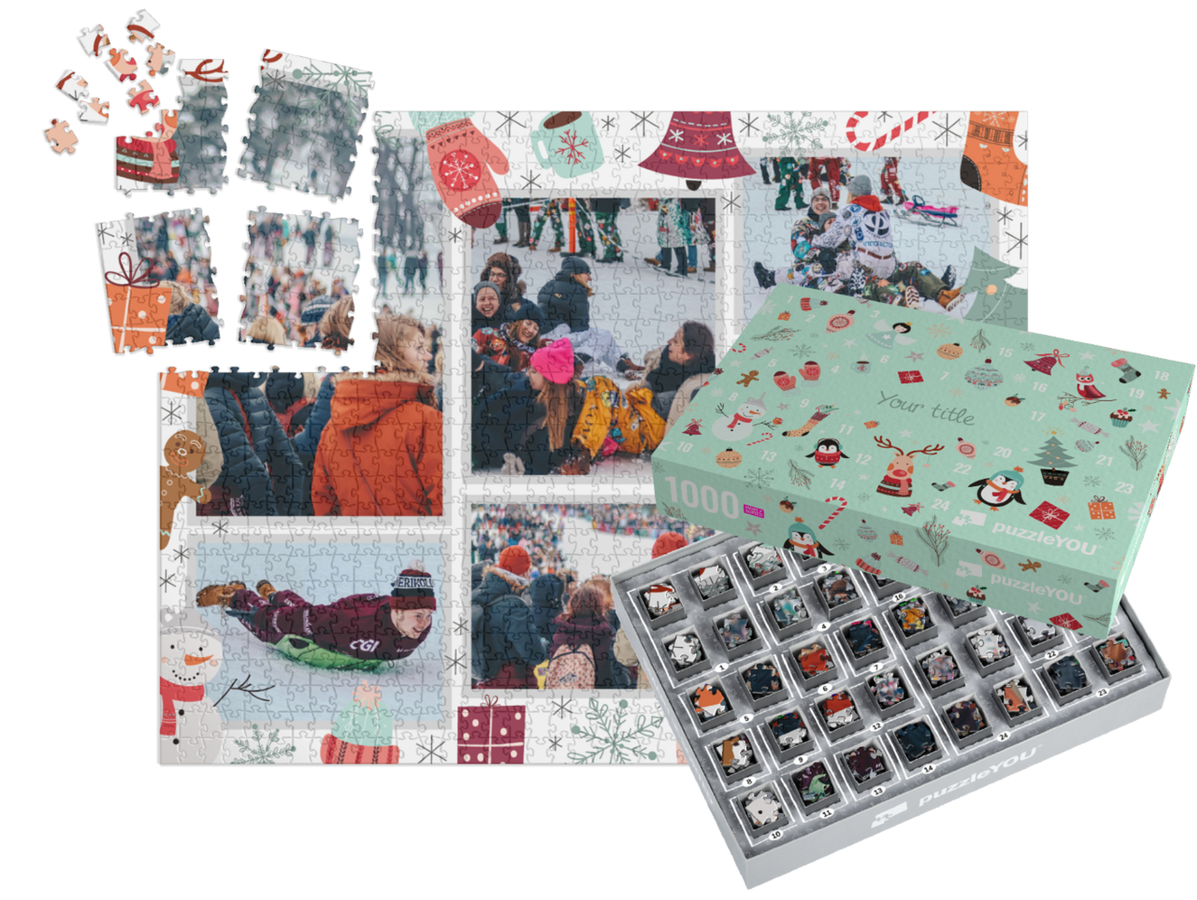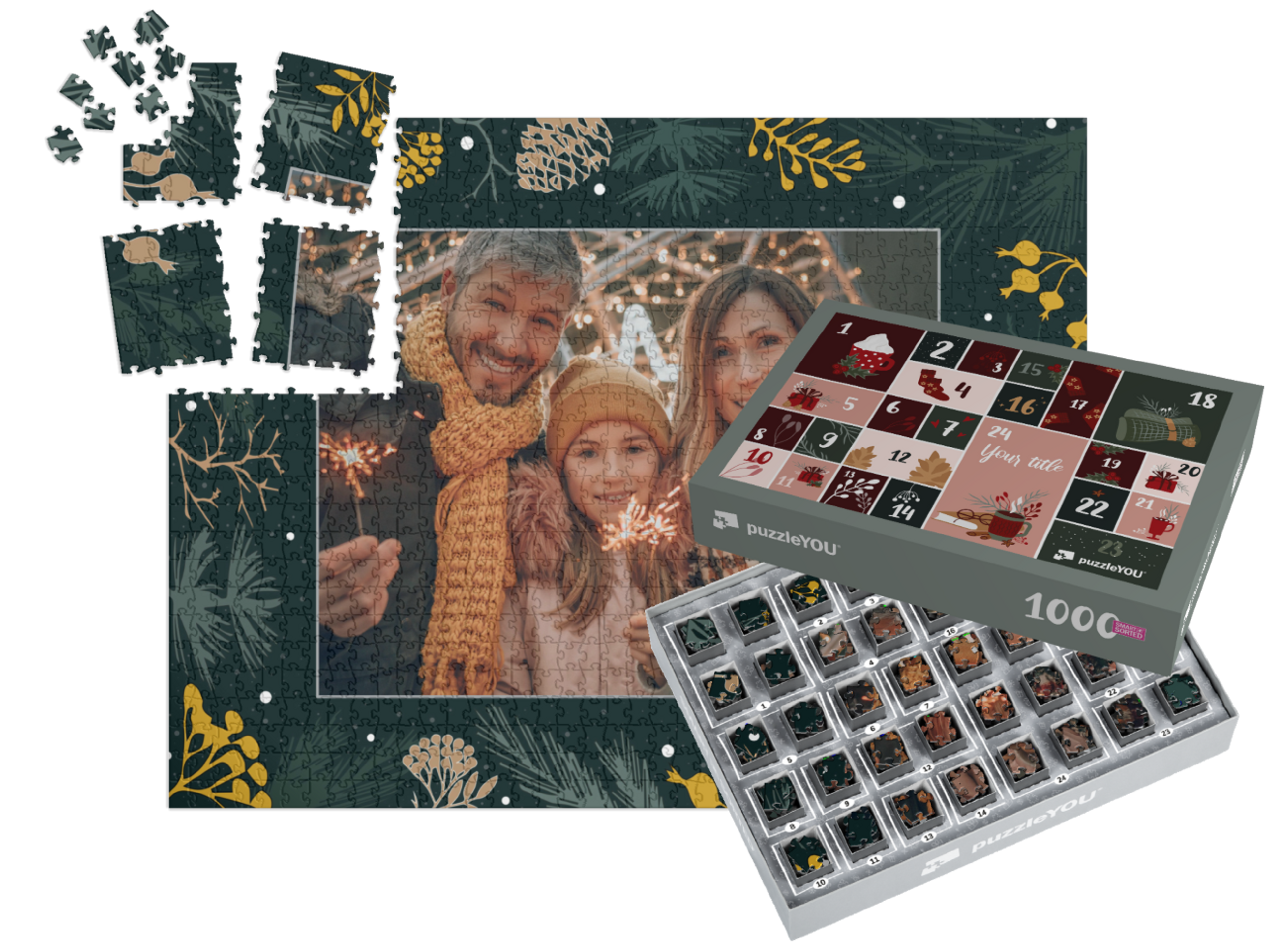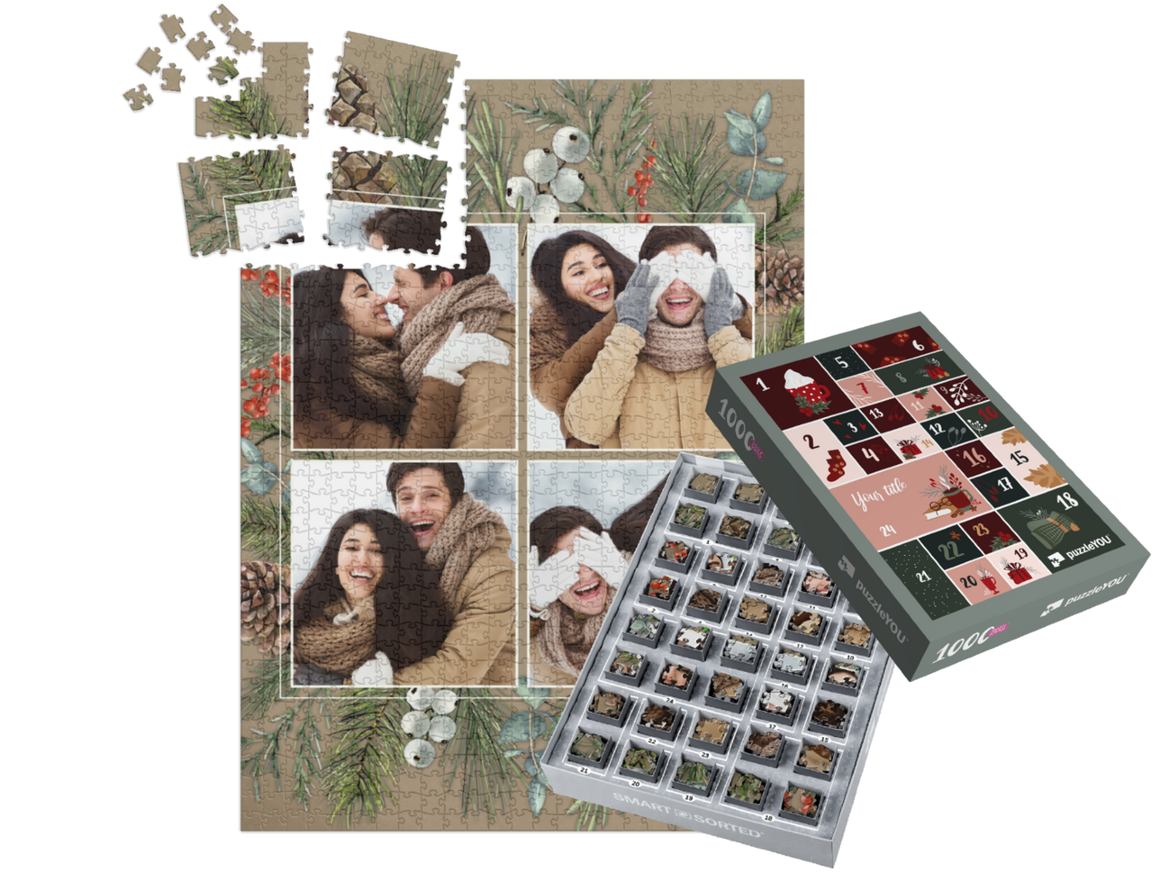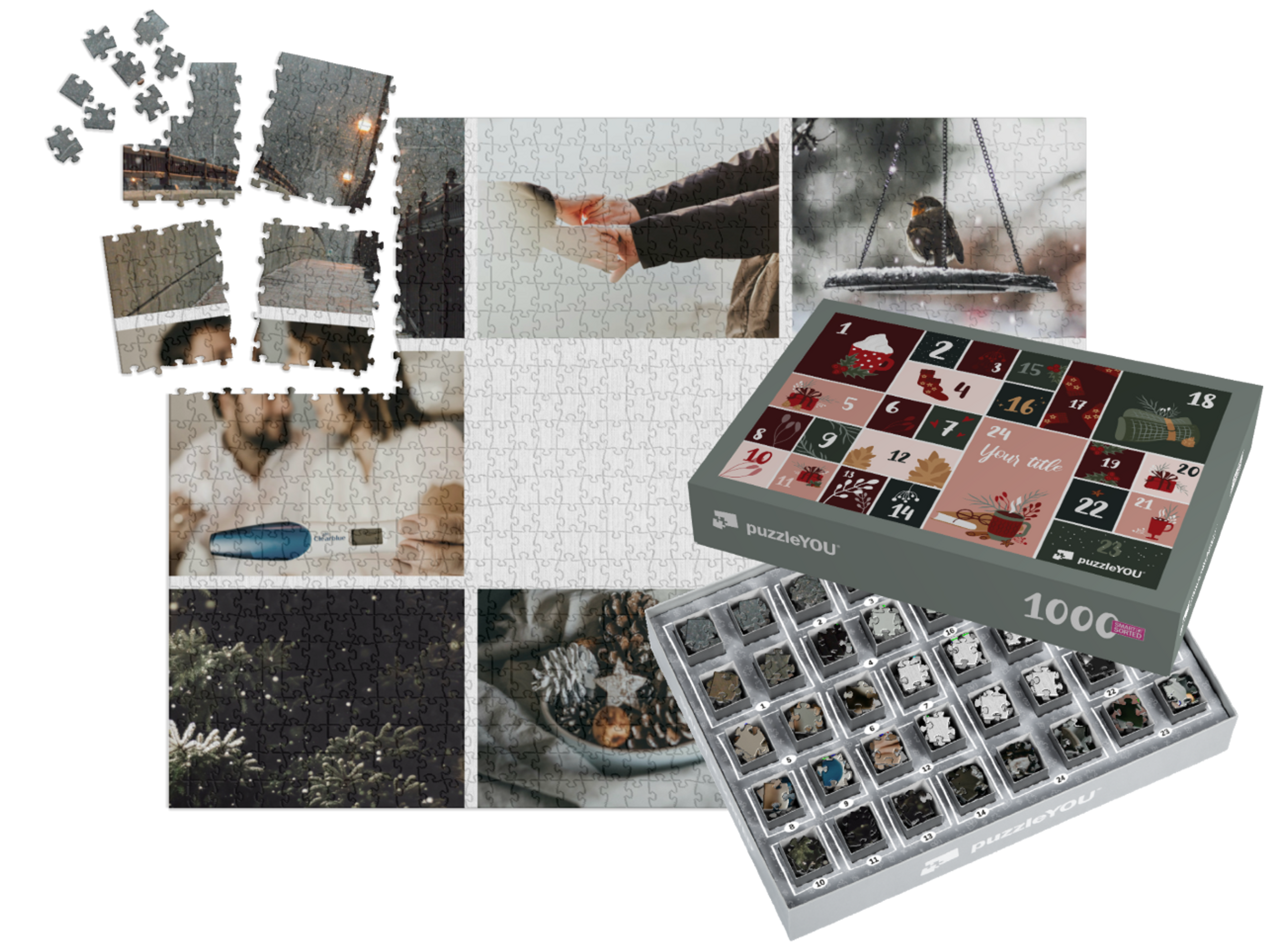 The puzzleYOU Advent calendar is a custom 1000-piece puzzle that arrives pre-sorted! Complemented by an amazing selection of Christmas-themed box designs, it screams Advent calendar even at a quick glance. A variation of SMART SORTED, a new section of the puzzle is put together on each day of Advent. The calendar shows which boxes to assemble each day until the puzzle is finished on Christmas Eve! Make the season more memorable with an Advent calendar custom puzzle!