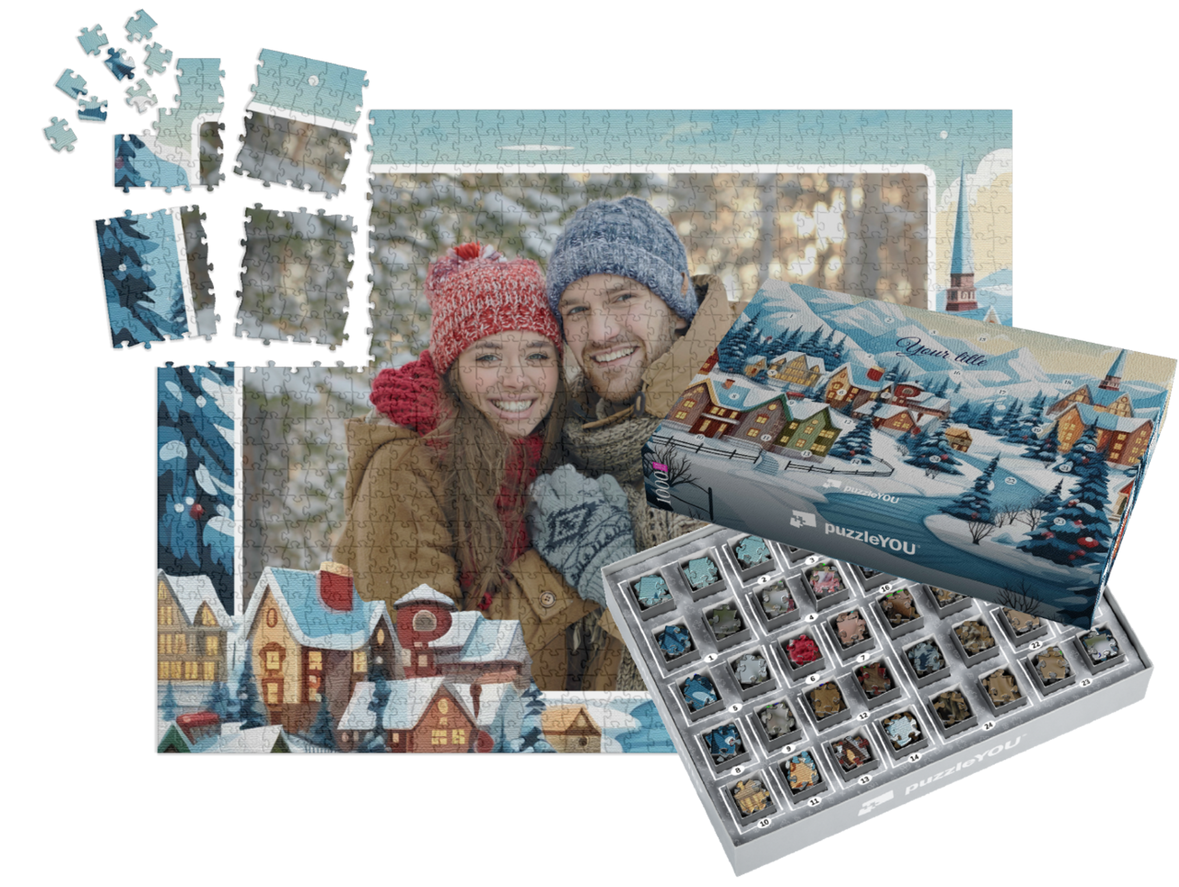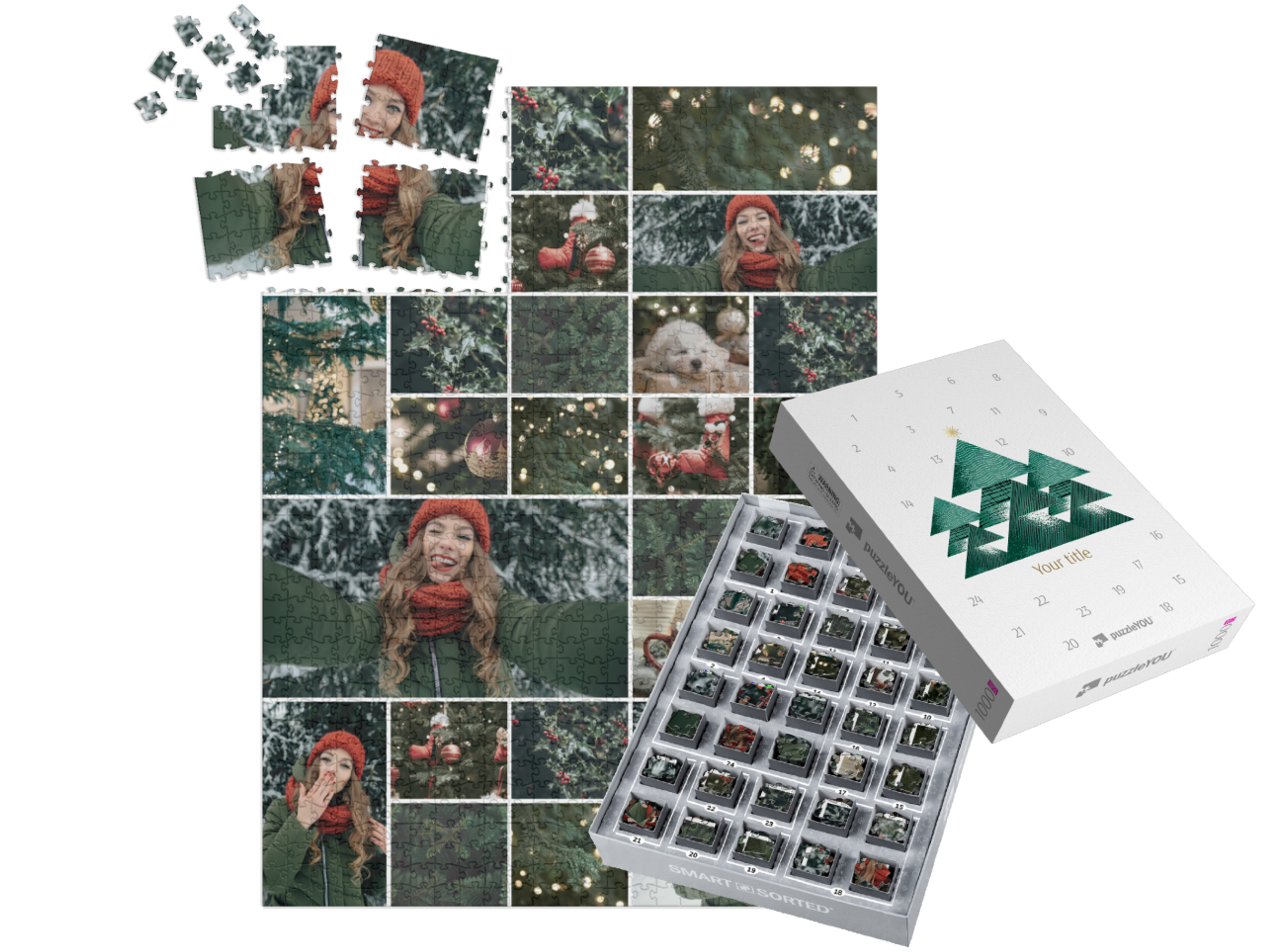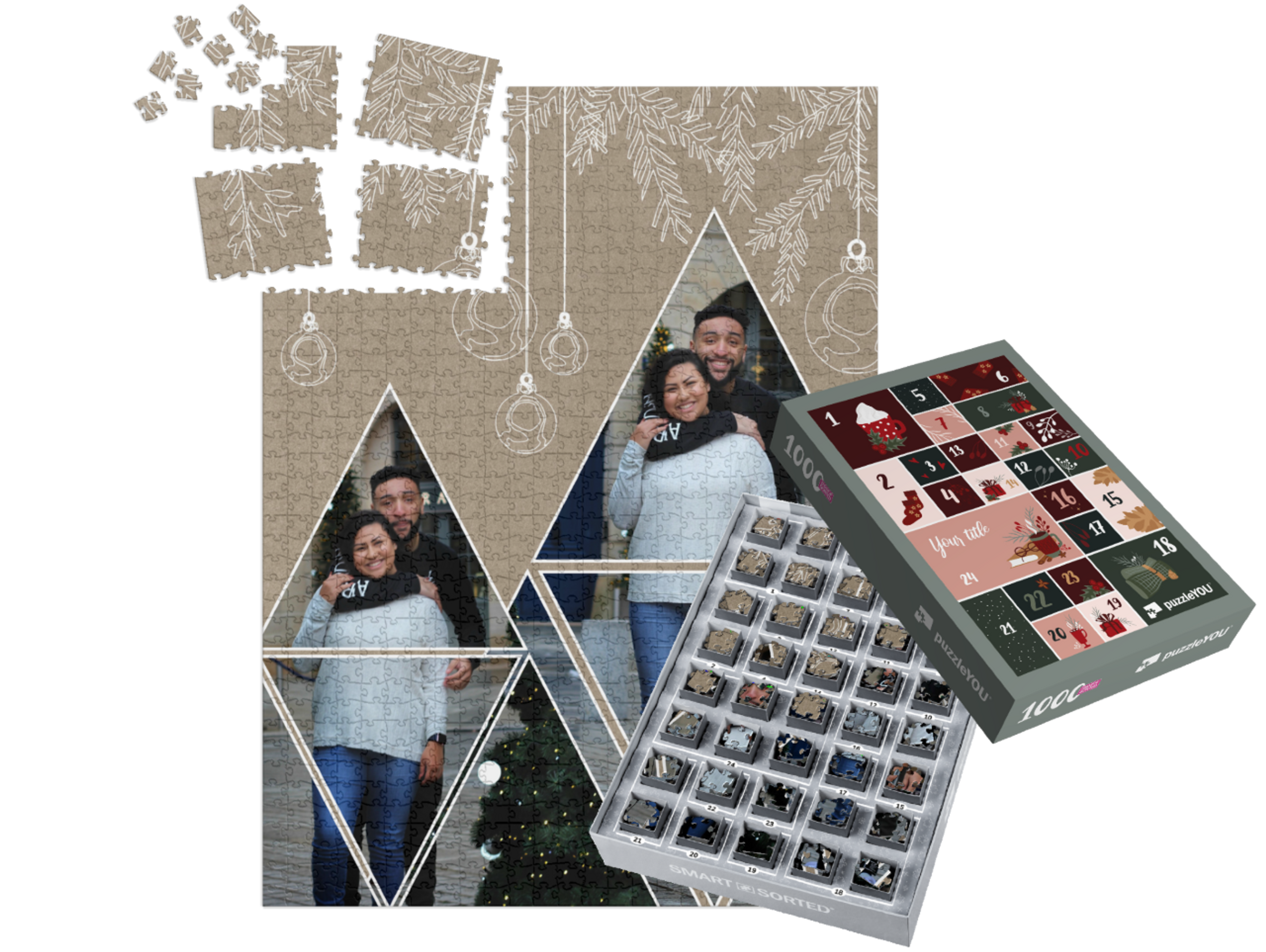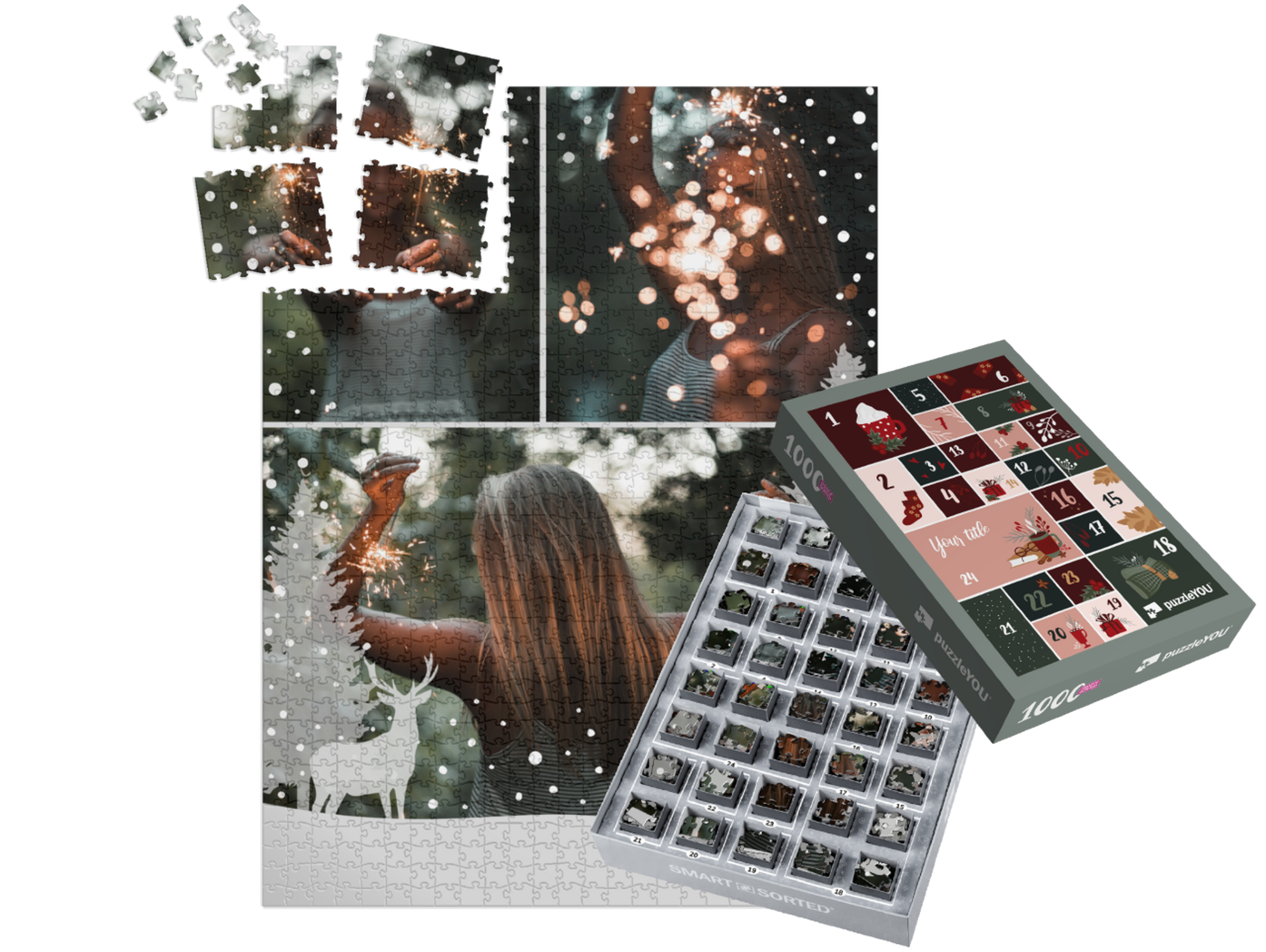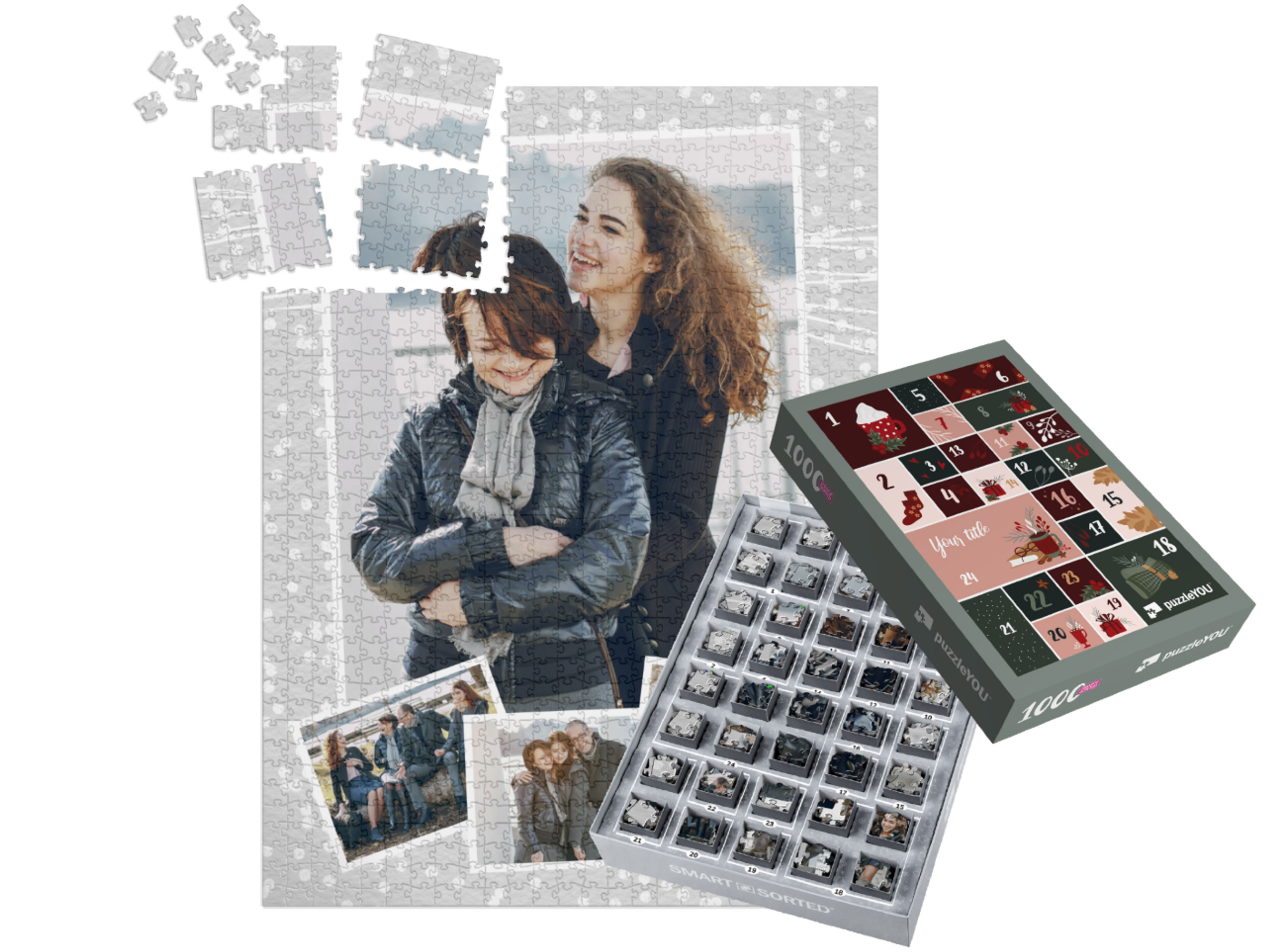 The puzzleYOU Advent calendar is a custom 1000-piece puzzle that arrives pre-sorted! Complemented by an amazing selection of Christmas-themed box designs, it screams Advent calendar even at a quick glance. A variation of SMART SORTED, a new section of the puzzle is put together on each day of Advent. The calendar shows which boxes to assemble each day until the puzzle is finished on Christmas Eve! Make the season more memorable with an Advent calendar custom puzzle!