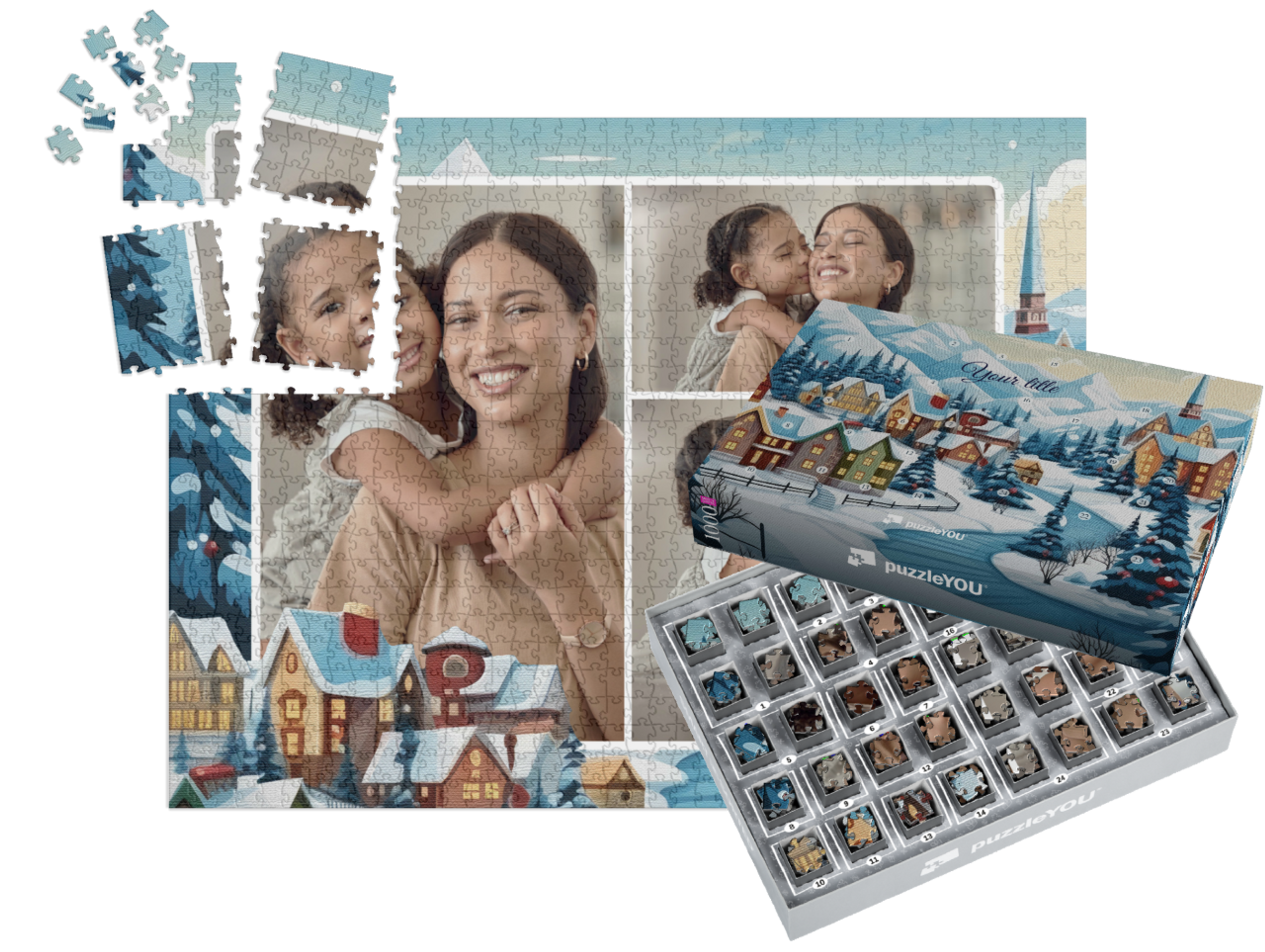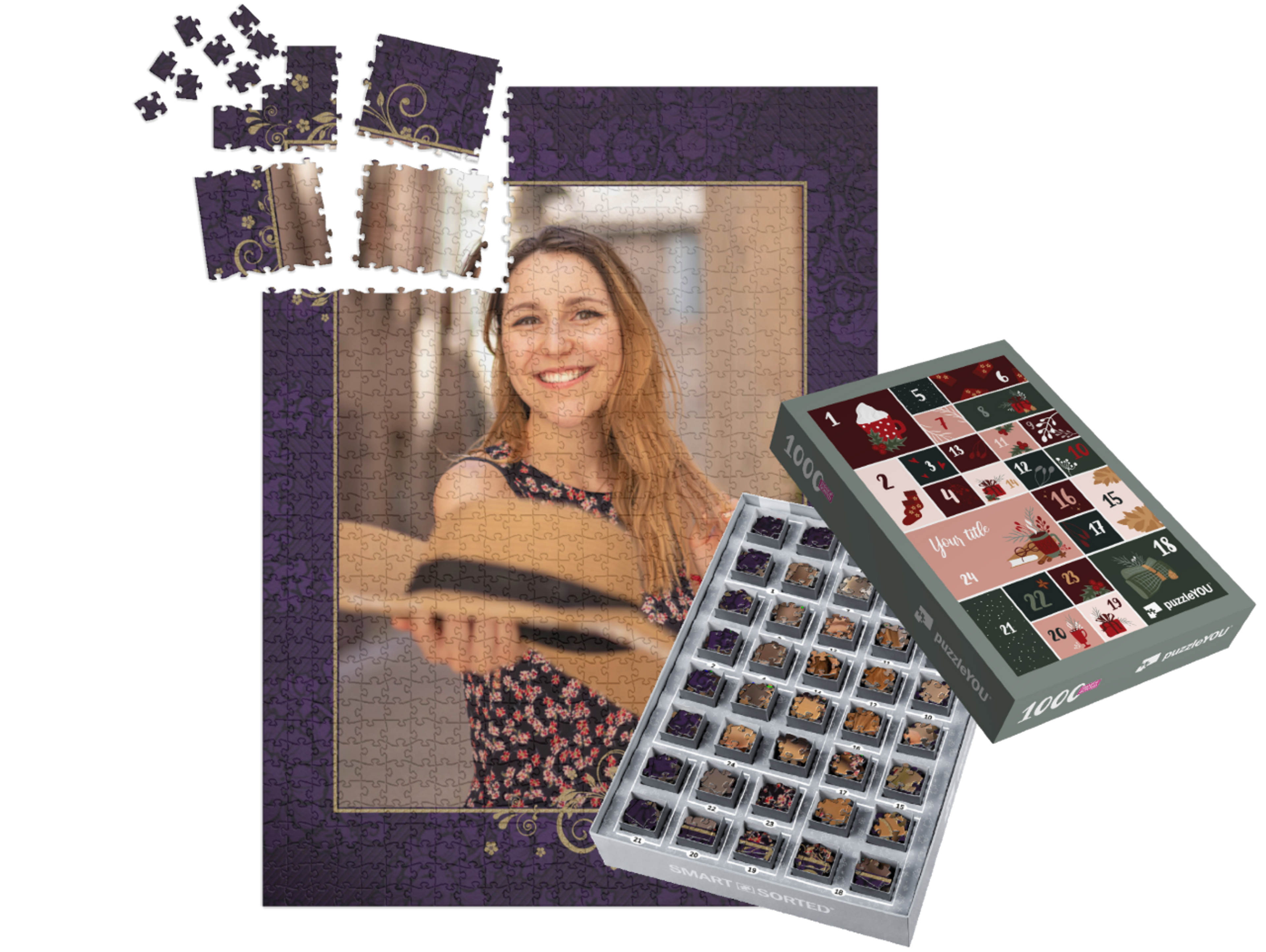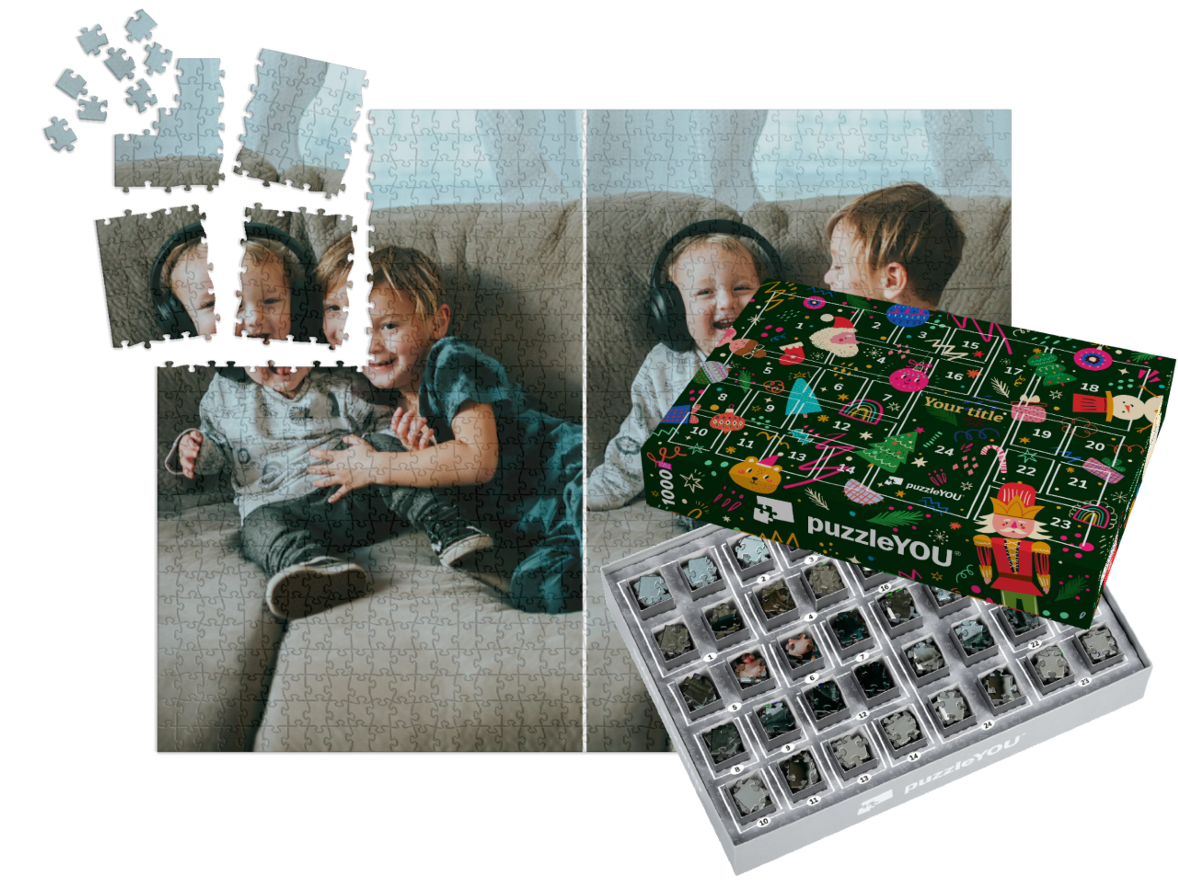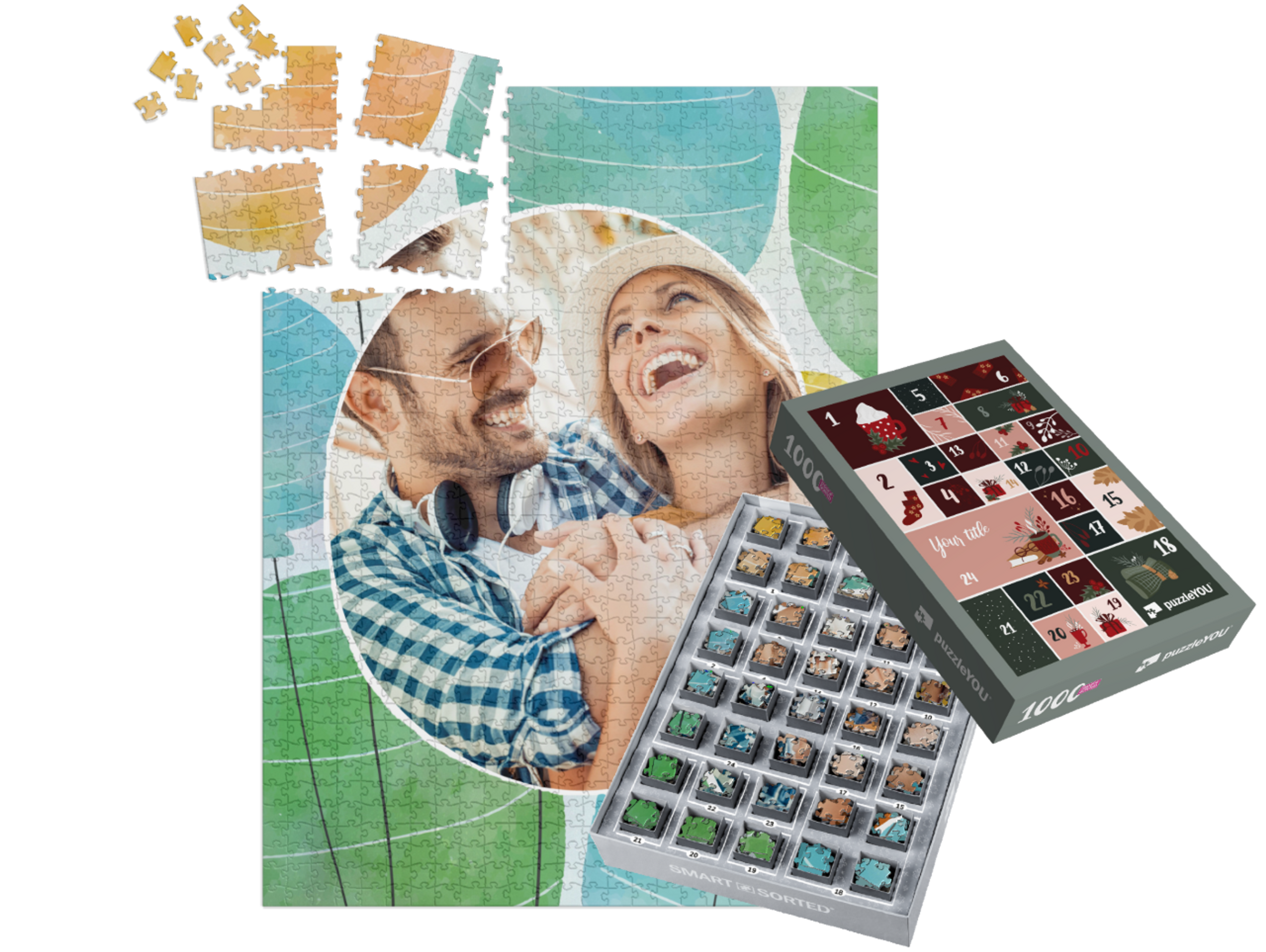 The puzzleYOU Advent calendar is a custom 1000-piece puzzle that arrives pre-sorted! Complemented by an amazing selection of Christmas-themed box designs, it screams Advent calendar even at a quick glance. A variation of SMART SORTED, a new section of the puzzle is put together on each day of Advent. The calendar shows which boxes to assemble each day until the puzzle is finished on Christmas Eve! Make the season more memorable with an Advent calendar custom puzzle!