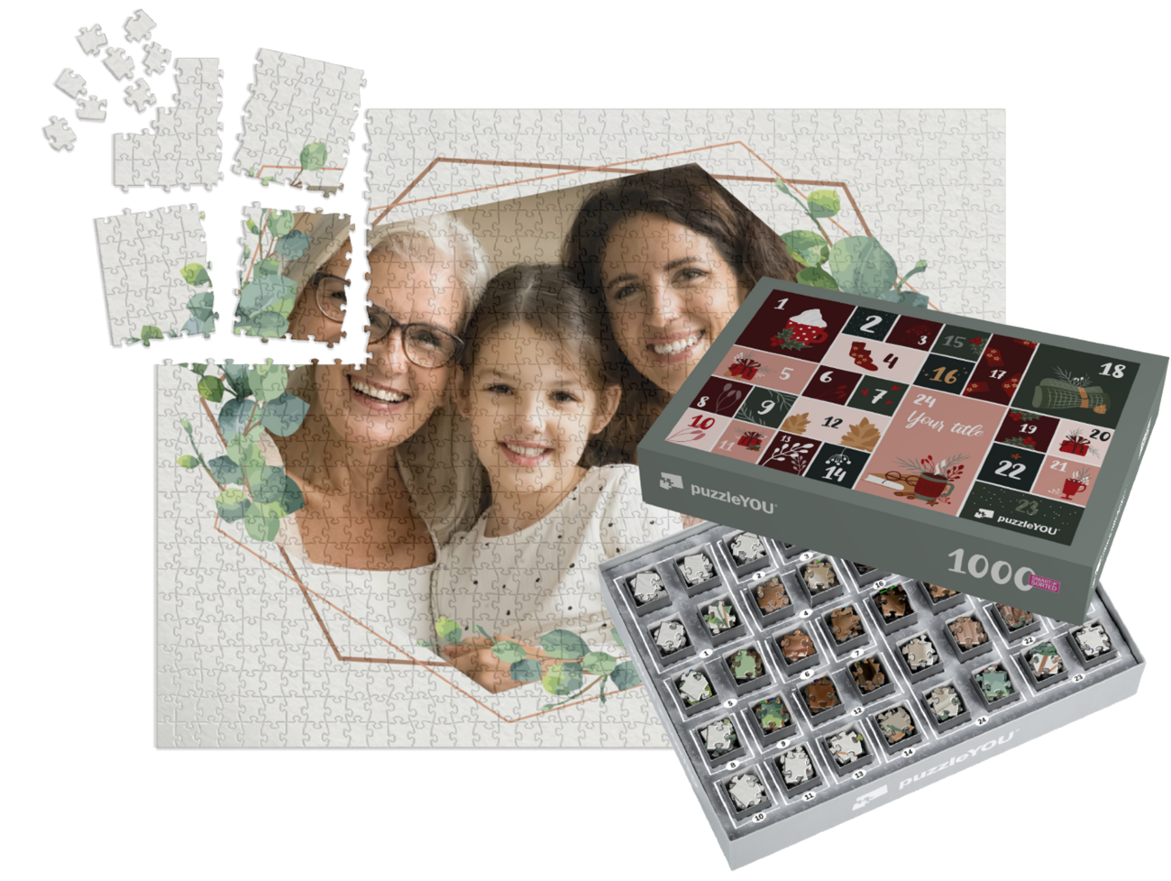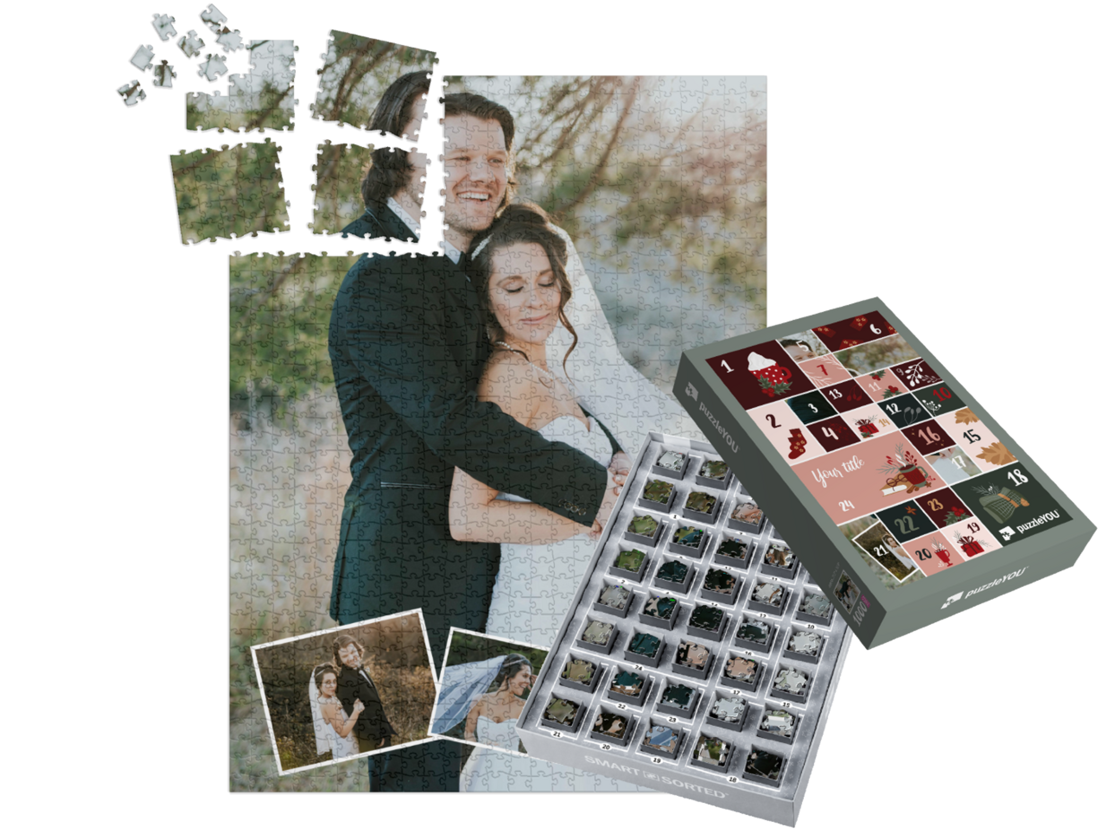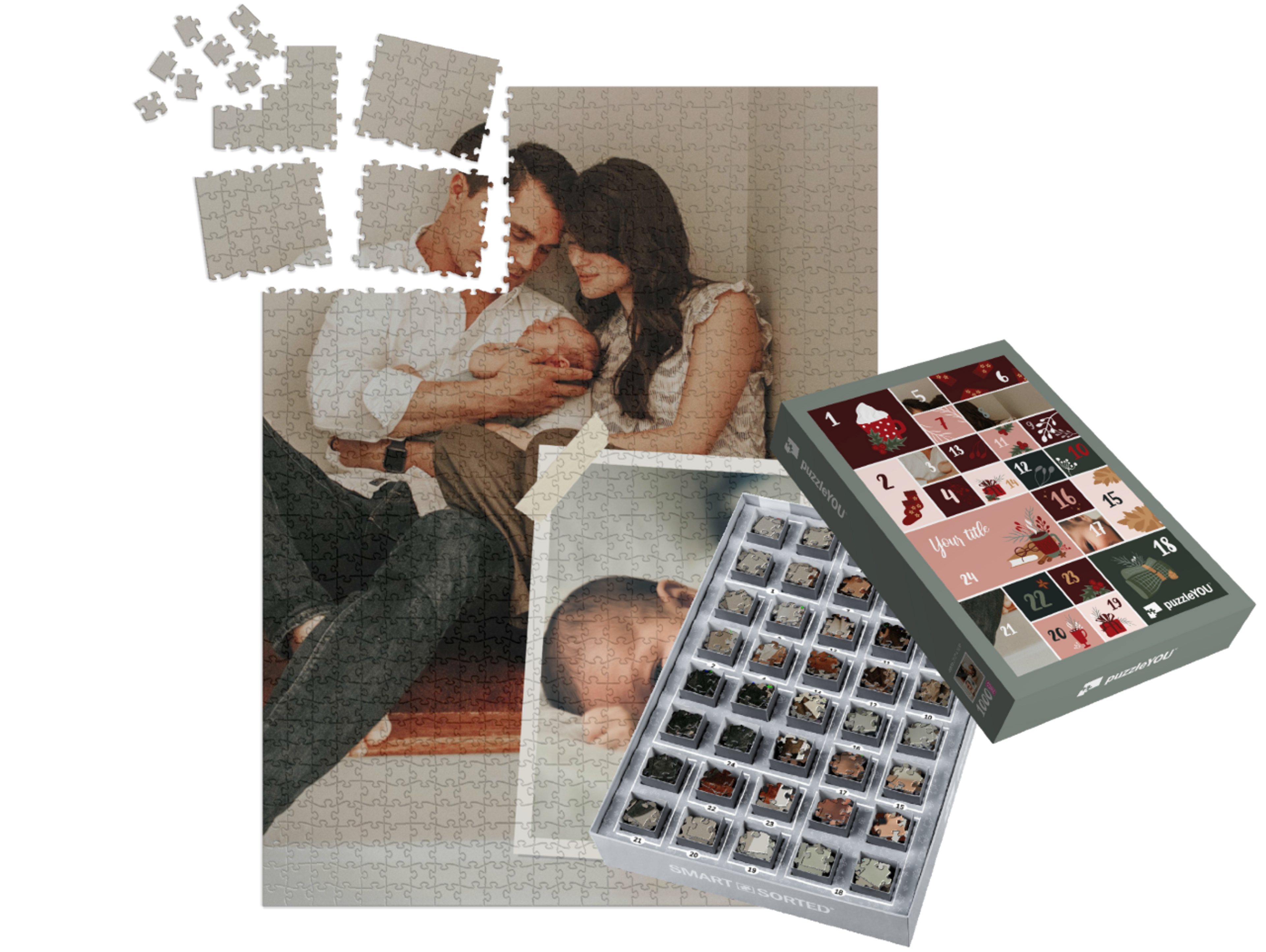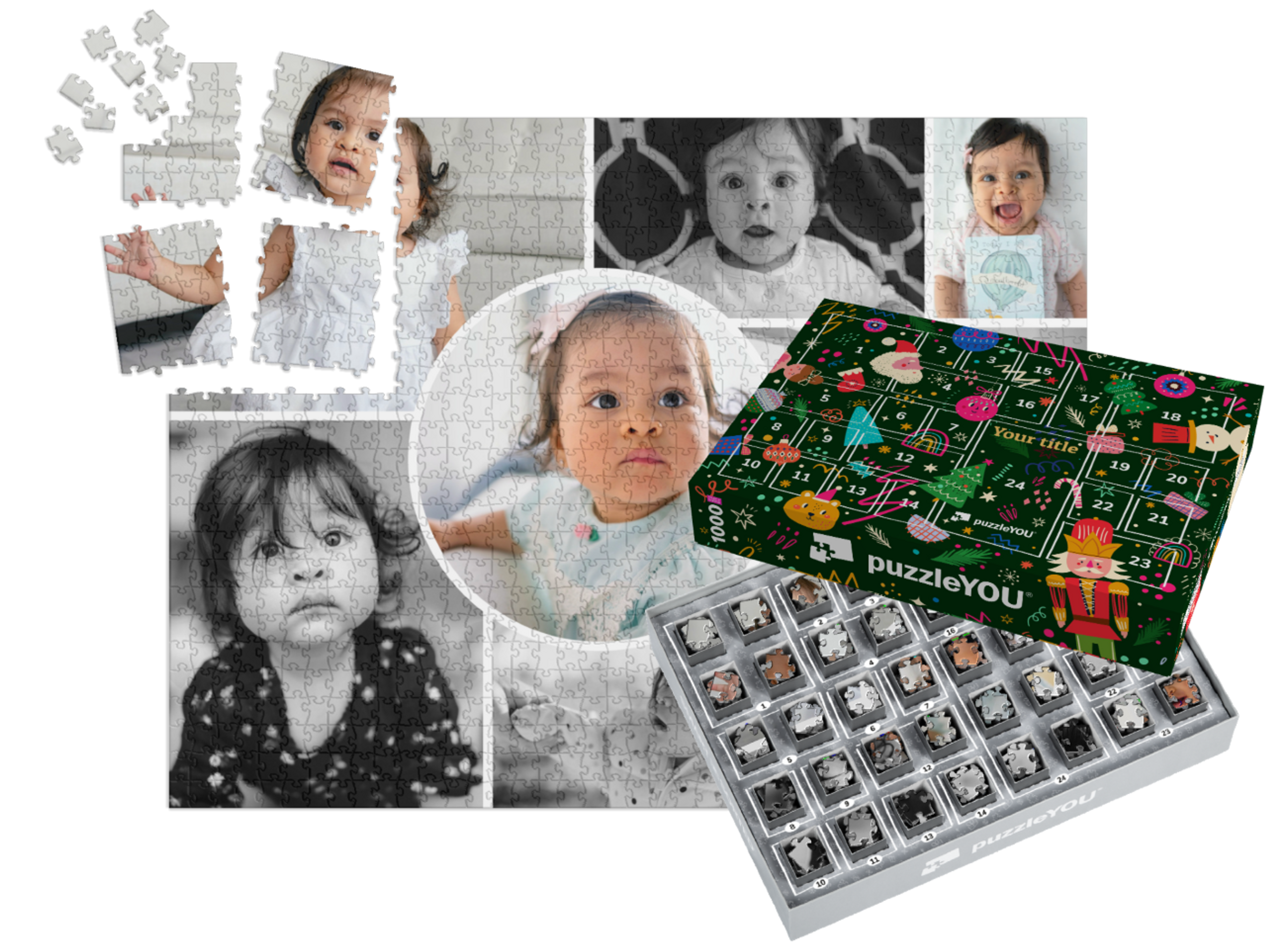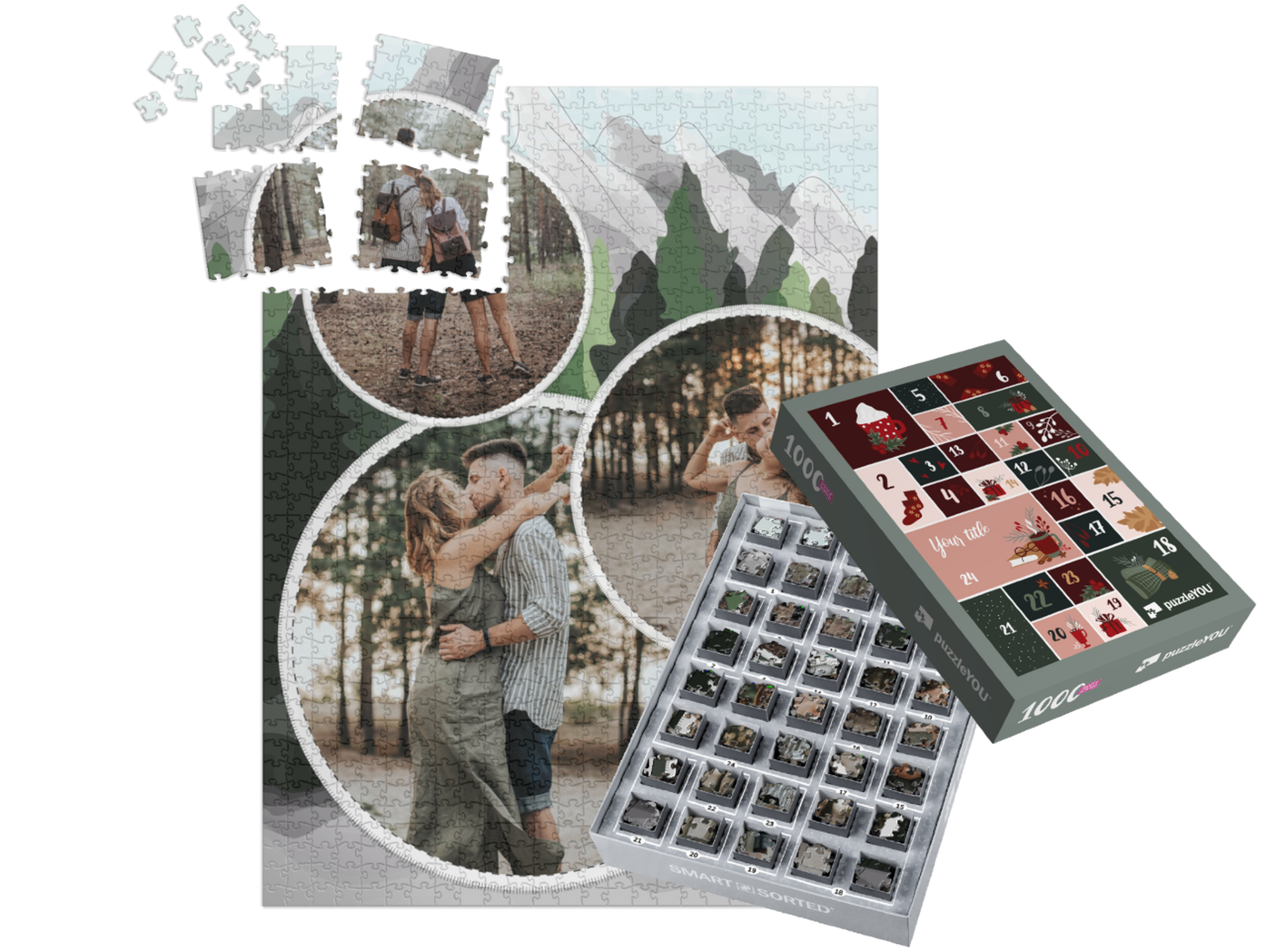 The puzzleYOU Advent calendar is a custom 1000-piece puzzle that arrives pre-sorted! Complemented by an amazing selection of Christmas-themed box designs, it screams Advent calendar even at a quick glance. A variation of SMART SORTED, a new section of the puzzle is put together on each day of Advent. The calendar shows which boxes to assemble each day until the puzzle is finished on Christmas Eve! Make the season more memorable with an Advent calendar custom puzzle!